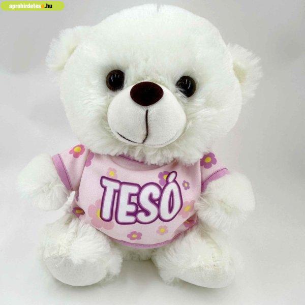 Plüss maci barna és fehér színben, levehető pólóján színes felirattal. 25 cm