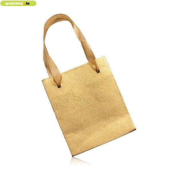 Ajándék ötletek rovaton belül a(z) "Ajándéktáska, fényes rácsos felület arany színben, szalagok" című hirdetést látja. (fent)
