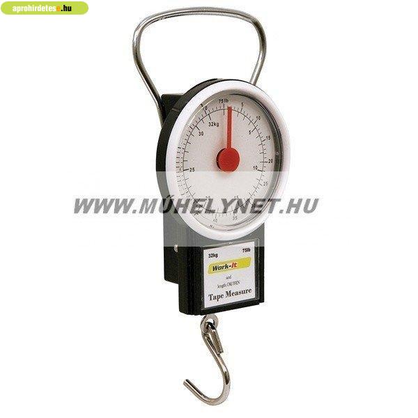 mérleg. Az akasztó kapóval sok minden mérhető. Beépített 1 m-es mérőszalag a