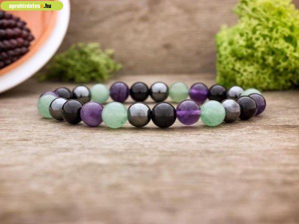 aventurin és ametiszt 8mm-es ásvány gyöngyökből áll. Az ásvány golyók gumira