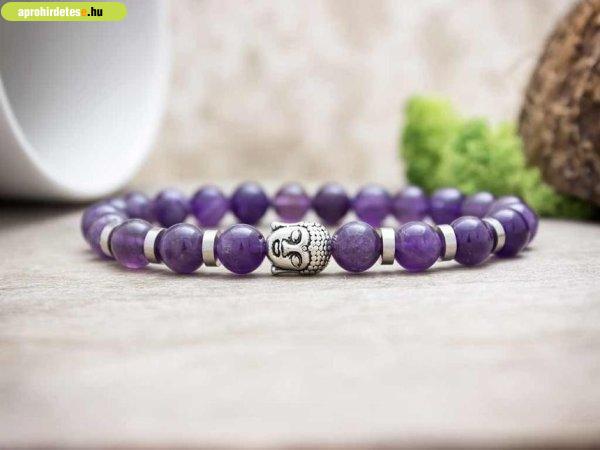 8 mm-es ametiszt ásvány gyöngyökből speciális gumira fűzött ezüst színű Buddha