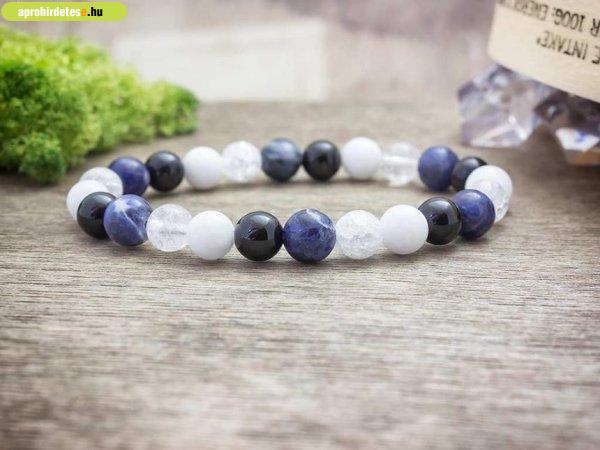 Jáde, ónix, szodalit és roppantott hegyikristály ásványokból fűzött gumis