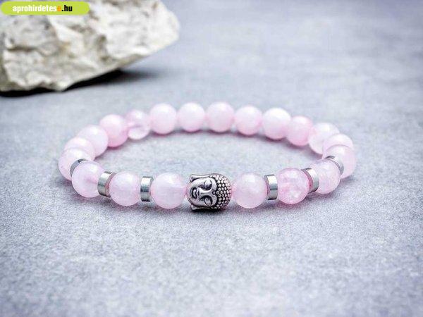 8 mm-es rózsakvarc ásvány gyöngyökből speciális gumira fűzött ezüst színű Buddha