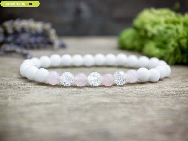 A 6 mm-es rózsakvarc, jáde és roppantott hegyikristály gyöngyök gumira vannak