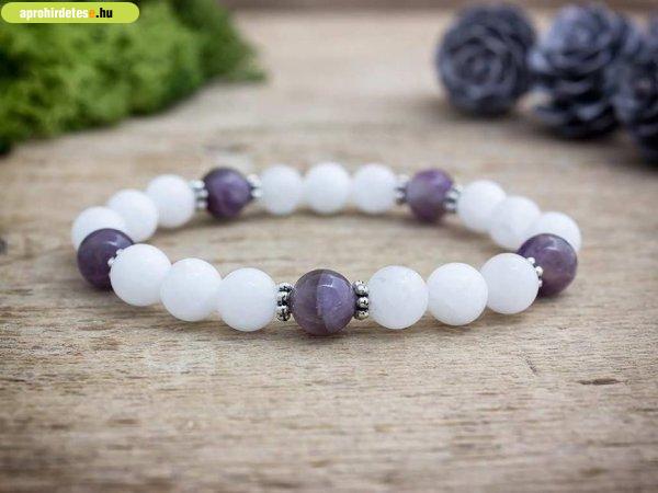 8 mm-es tejkvarc és ametiszt ásvány gyöngyökből fűzött gumis karkötő. Az ékszert