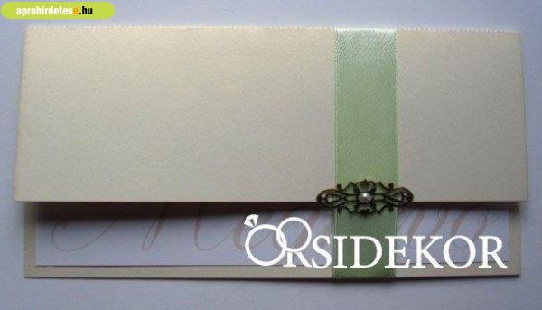 Esküvői meghívó szalaggal, fém dísszel és gyönggyel