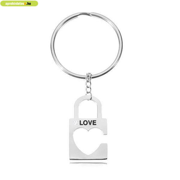 A lakat alakú kulcstartó fényes, közepén szív alakú kivágással, beágyazott