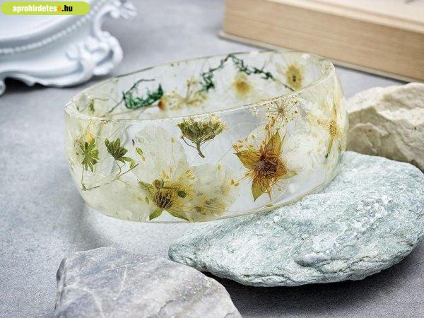 Műgyantába rejtett szárított virágok. Belső átmérője: 6.9 cm. Egyedi tervezés
