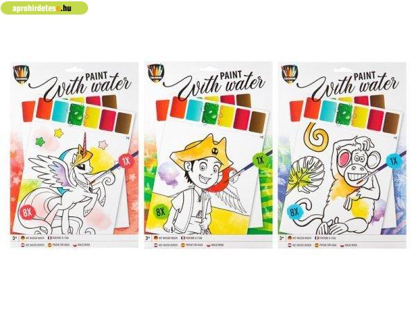 Gyerekjáték rovaton belül a(z) "Fess vízzel, 8 lap, A4 méret, ecsettel, 3 féle" című hirdetést látja. (fent)