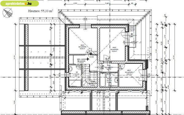 nm-es garázs és 6 nm-es fedett bejárat.Az emeleten egy 13.4 nm-es szoba, 2.3