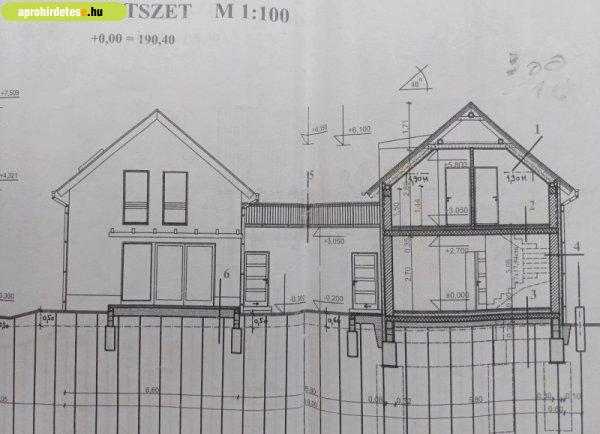 lépcsőfeljáró, garázs-emeleten: 3 szoba (az egyik nagy erkéllyel), fürdőszoba,