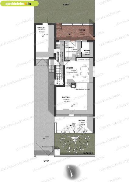 előszoba, nagy nappali, étkező, konyha, kamra, WC. A konyhából a 16,8 nm-es