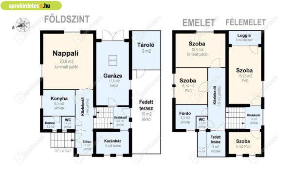 előszoba, közlekedő - a félemeleten 2 szoba és egy loggia - az emeleten 2 szoba,