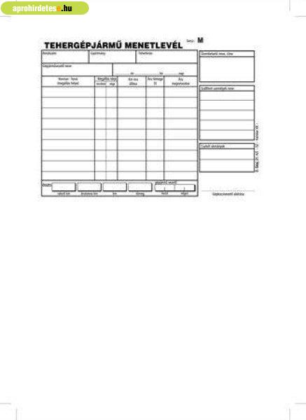 Irodatechnika, Biztonságtechnika rovaton belül a(z) "Nyomtatvány, menetlevél, tehergépjármű, 100 lap, A5, fekvő, " című hirdetést látja. (fent)