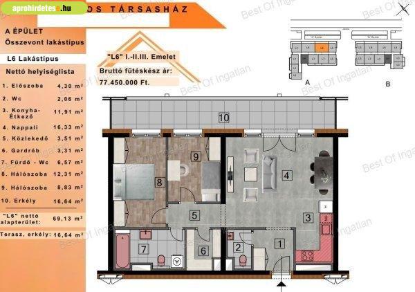 megtalálhatóak, alapterülete 69,13 m2 + 16,64 m2 erkélykapcsolattalBelső