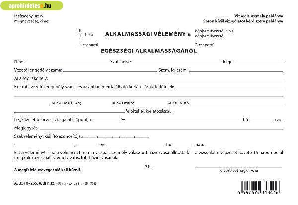 fekvő Alkalmassági vélemény a gépjárművezetői alkalmasságról 2 lapos garnitúra