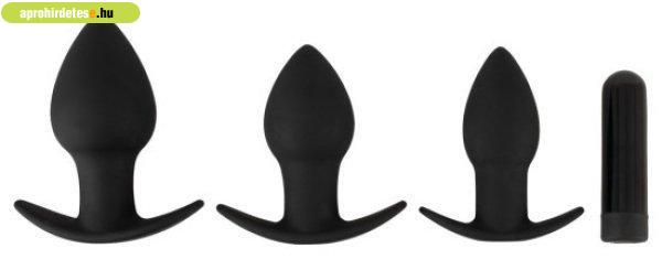 A készlet három különböző méretű anális dugót és egy vibrációs golyót tartalmaz,