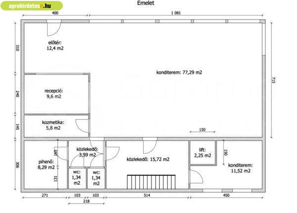 közlekedő, 2 db WC.Megjegyzés: A lift jelenleg üzemen kívül