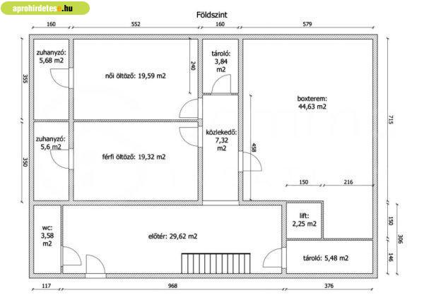 van.Földszint:-Sportolói területek: Bokszterem, női és férfi öltözők